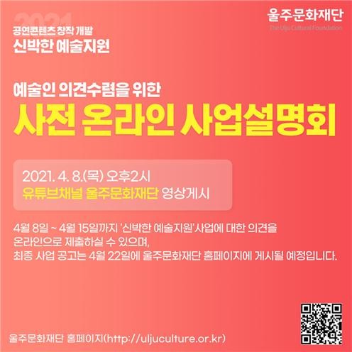 (재)울주문화재단(대표이사 이상용)은 8일 울주의 대표 공연 레퍼토리 개발을 위한‘신박한 예술지원’사전 온라인 사업설명회를 울주문화재단 유튜브 채널에 게시한다고 밝혔다.
