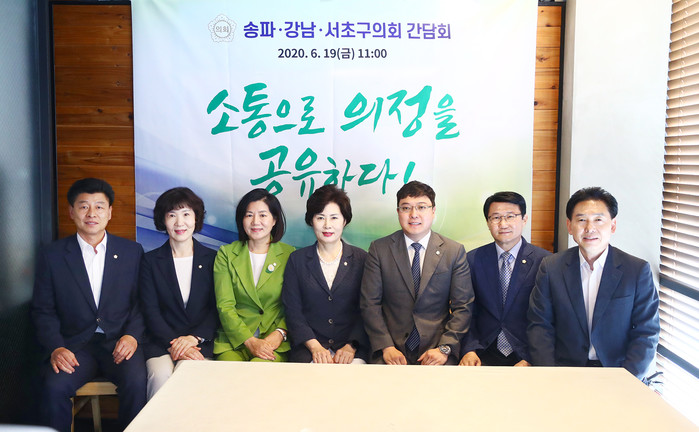 ‘소통으로 의정을 공유하다’라는 슬로건을 내걸고 열린 이날 간담회에는 송파구의회 이성자 의장, 송기봉 운영위원장, 윤영한 행정보건위원장, 박경래 재정복지위원장, 강남구의회 이관수 의장, 김광심 운영위원장, 서초구의회 안종숙 의장이 참석했다.