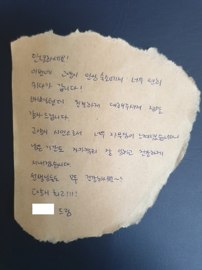 “고양시민으로서 자부심을 느꼈습니다. 남은 기간도 자가격리 잘 임하겠습니다. 모두 건강하세요, 고양시 최고!” 젊은 여성이 쓴 정갈한 쪽지도 눈에 띈다.