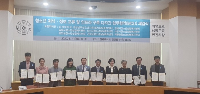 인제대학교(총장 전민현) 인당관 14층 회의실에서 진행된 이번 업무협약식에는 함안군청소년상담복지센터 홍영식 센터장, 인제대 전민현 총장, 경상남도청소년지원재단 차윤재 원장을 비롯한 6개 시·군 청소년상담복지센터장과 관계자가 참석했다.