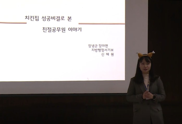 신혜원 주무관은 ‘치킨집 성공비결로 본 친절공무원 이야기’란 주제로 1,000만 관객 돌파 영화 ‘극한직업’에 나오는 치킨집의 성공과 친절 공무원의 비결을 비교하여 실력, 신속성, 서비스, 진심과 마음가짐이라는 주제를 쉽고 재치 있게 표현해 심사위원들로부터 많은 공감을 얻었다.