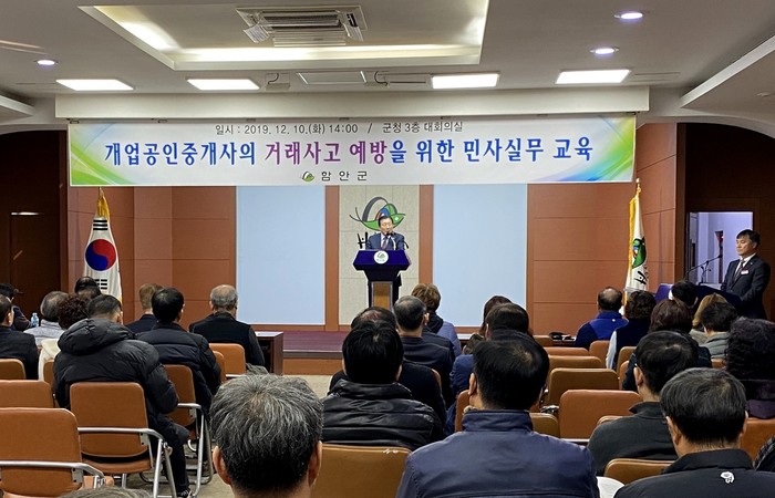 함안군은 지난 10일 오후 2시 군청 3층 대회의실에서 관내 개업공인중개사 및 소속공인중개사 110여 명를 대상으로 부동산 거래사고 예방 교육을 실시했다.