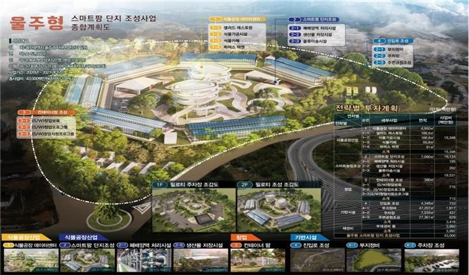 울주형 스마트팜 단지 조성 사업 총 예산은 군비 430억원으로, 이 가운데 올해 60억원이 편성돼 있으며, 2021년 10월 착공 예정이다.