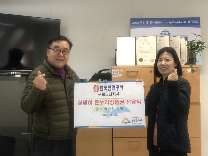 [시민일보 = 여영준 기자] 서울 금천구(구청장 유성훈)는 지난 22일 오전 11시 한국전력공사 구로금천지사가 다가오는 명절을 맞아 금천구시각장애인협회와 지역아동센터에 온누리상품권 200만원을 전달했다고 밝혔다.