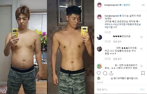 가수 강남이 상반신을 탈의한 다이어트 전후 사진을 인스타그램에 공개해 화제다.