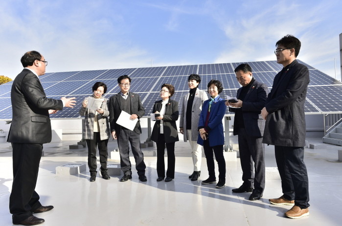 | ▲ 목동문화체육센터를 방문해 태양광 설치 현황을 살펴보는 행정재경위 위원들.(사진제공=양천구청) |