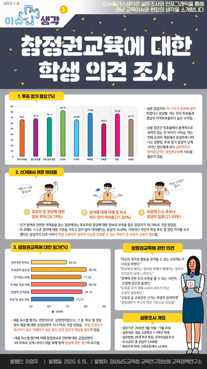 경상남도교육청 교육연구정보원(원장 이영주)은 지난 5월 19일부터 26일까지 8일간 고등학교 1~3학년 학생들을 대상으로 진행한 참정권교육에 대한 학생 의견 조사 결과를 인포그래픽의 형태로 발표했다.