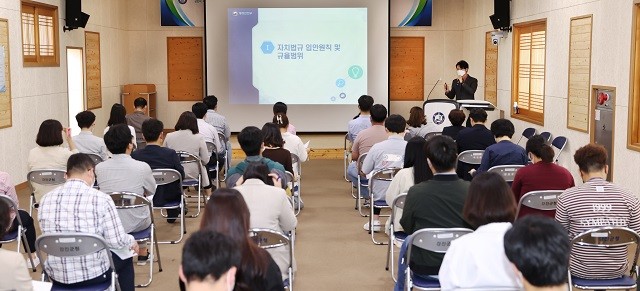 이날 강의는 자치법규 쟁점 사례와 재의・제소 업무 매뉴얼을 교육과목으로 구성하고, 자치법규 담당자 및 교육 희망 직원을 대상으로 행정안전부 자치법규과 변상혁 담당 사무관을 강사로 초빙해 사례 중심의 현장 밀착형 교육을 실시했다.