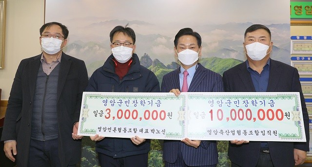 군에 따르면 지난 6일(수) 영암군청 군정홍보실에서 영암축산업협동조합에서 1천만 원을, 영암언론협동조합에서 3백만 원을 (재)영암군민장학회 장학기금으로 기탁하며 신축년 새해 장학금 기탁의 포문을 열었다.