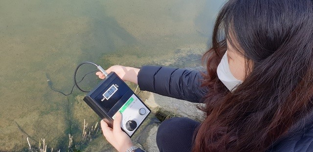 | ▲ 강진군농업기술센터 관계자, 관내 간척지 담수호 염농도 측정 / 사진=강진군 제공 |