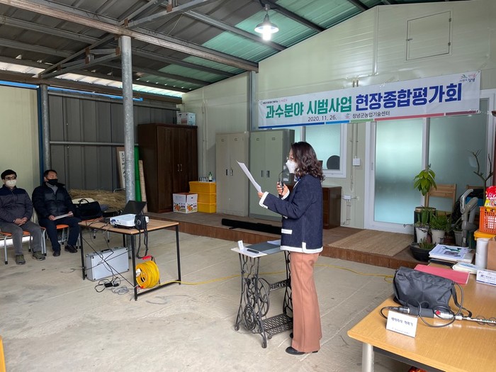 창녕군(군수 한정우)은 26일 창녕읍 퇴천리 소재 단감과원(농장주 김희덕)에서 과수분야 시범사업 참여농가가 참석한 가운데 2020년 과수분야 시범사업 현장 종합평가회를 개최했다.