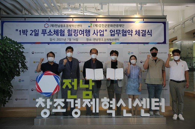 | ▲ 강진군문화관광재단-전남창조경제혁신센터, 강진군 푸소체험 힐링여행 방송 판매를 위한 업무 협약 체결 기념촬영 / 사진=강진군 제공 |