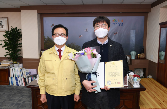 | ▲ 한정우 군수(왼쪽)가 신고자(박대현, 오른쪽)에게 감사장을 수여하고 기념촬영을 하고 있다. |