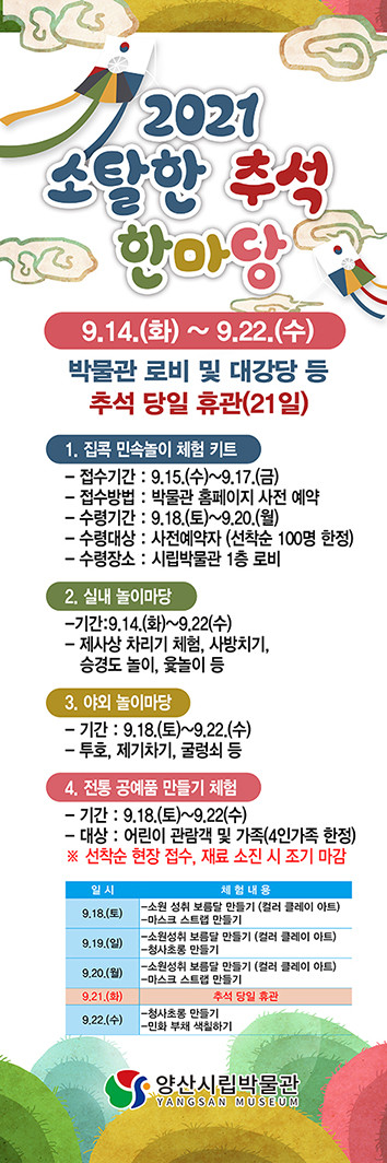 양산시립박물관(관장 신용철)은 민족의 최대 명절인 추석을 맞이하여 14일부터 22일(수)까지 온라인과 오프라인에서 동시에 ‘소탈한 추석 한마당’을 운영한다.
