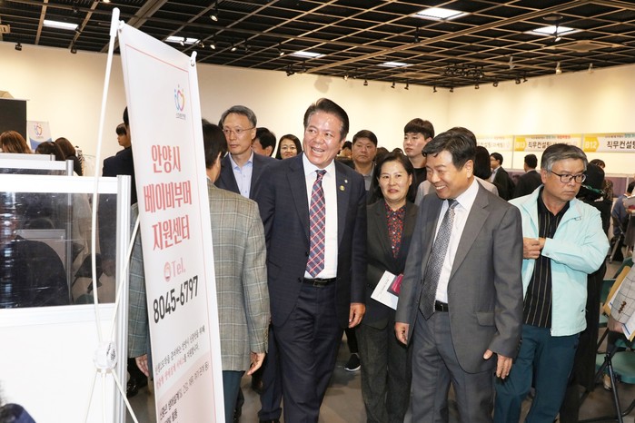| 지난해 열린 취업박람회에 참석한 최대호 시장이 관계자들과 현장을 둘러보고 있다.(사진제공=안양시청) |