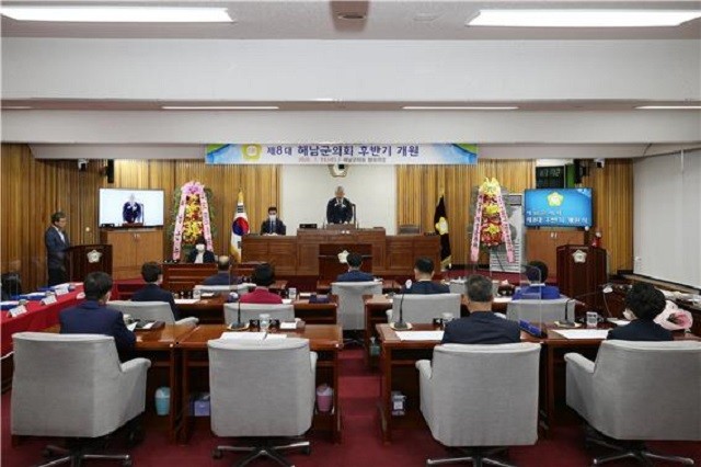 [해남=정찬남 기자] 전남 해남군의회가 지난 15일 제8대 후반기 개원식 및 제304회 임시회를 개회하고 첫 의정활동을 시작했다. 이날 의원들은 개원식에 앞서 순국선열들의 넋을 기리기 위해 현충탑 참배를 마치고 곧바로 후반기 일정에 돌입했다.
