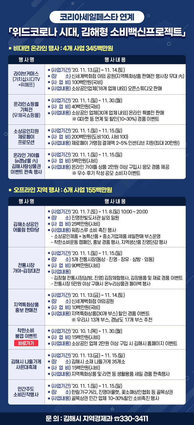 코리아세일페스타는 유통, 제조, 서비스 기업의 세일행사가 한데 모인 민간주도의 대한민국 대표 쇼핑할인행사이며 김해형 소비백신프로젝트는 온·오프라인 10개 세부사업으로 진행된다.