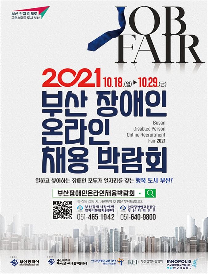 [부산=최성일 기자] 부산시가 코로나19 시대에 장애인 일자리 활성화를 위해 한국장애인고용공단·부산경영자총협회·연구개발특구진흥재단과 함께 18일부터 오는 29일까지 2주간 '2021 부산 장애인 온라인 채용 박람회'를 개최한다.