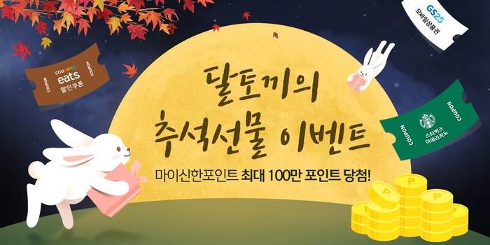 ‘달토끼의 추석선물 이벤트’는 신한 쏠(SOL)에서 하루에 한번 윷을 던져 토끼를 고향인 보름달에 보내주는 윷놀이 컨셉으로 7개의 점에서는 마이신한포인트 3P를, 5개의 럭키박스에서는 쿠팡이츠 할인쿠폰 1만원 등을 랜덤으로 제공한다.