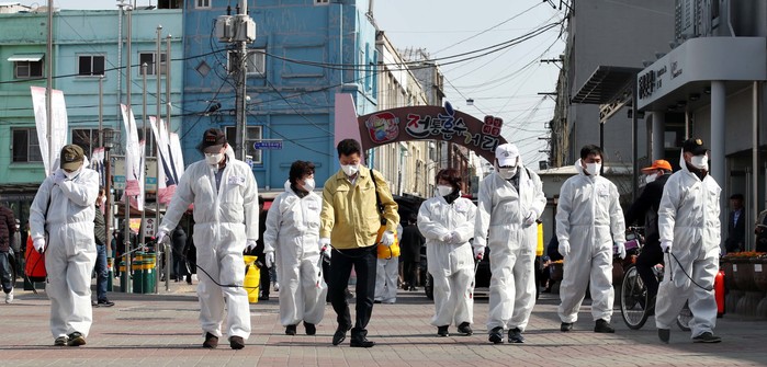 | ▲ 전통혼수거리 중앙시장을 방문한 허인환 동구청장(왼쪽 네번쨰)이 특수임무유공자회와 함께 길거리 방역을 하고있다. |