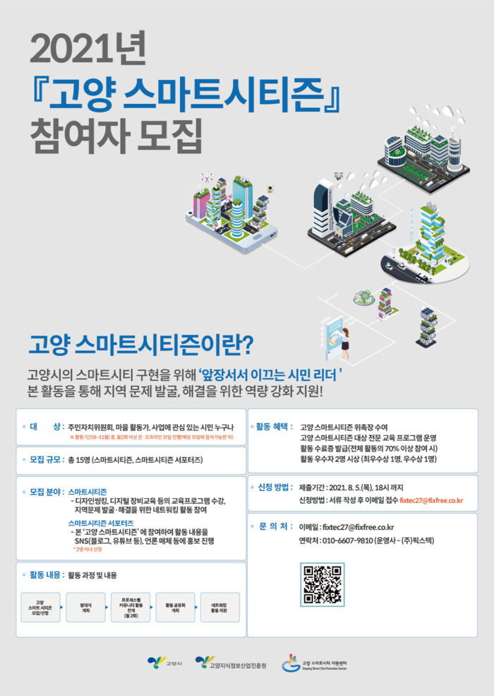 [고양=이기홍 기자] 고양시와 고양지식정보산업진흥원(원장 오창희, 이하 진흥원)은 시민들이 스마트시티 구현에 지속적으로 동참할 수 있는 문화 확산을 위해 ‘고양 스마트시티즌’15명을 모집한다.