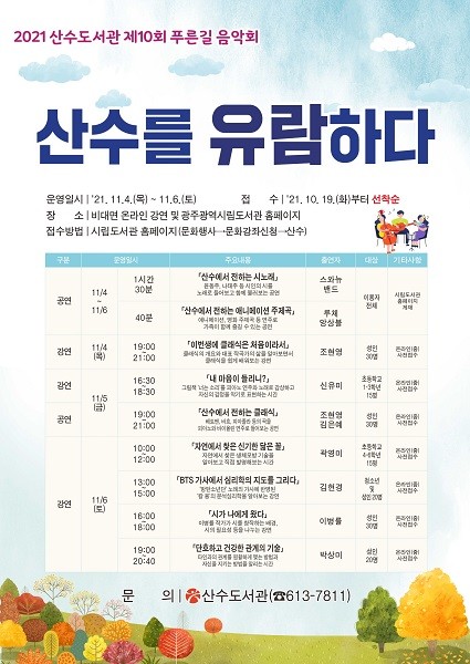 송은정 산수도서관 관리과장은 “코로나19로 힘들고 지친 이용자들이 가족과 함께 즐길 수 있는 프로그램을 마련했다”며 “이번 강연과 공연이 산수를 유람하 듯 편안한 시간을 제공하는 기회가 되길 바란다”고 말했다.