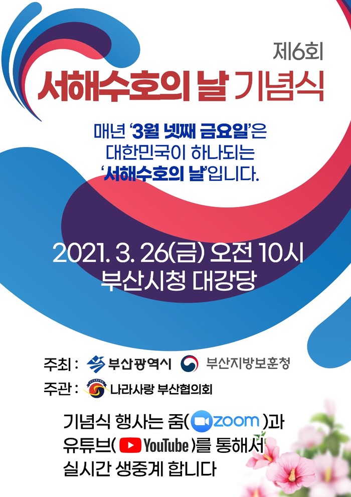 부산지방보훈청(청장 권율정)은 26일 금요일 오전 10시 부산시청 대강당에서 서해수호 희생 장병을 추모하기 위한 제6회「서해수호의 날」기념식을 개최할 예정이라고 밝혔다.