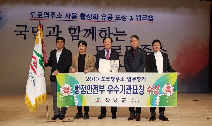 창녕군(군수 한정우)은 지난 10일, 행정안전부가 주관한 ‘2019년 주소정책 워크숍’에서 2019년 전국 도로명주소 업무 평가 우수기관으로 선정되어 행정안전부장관 표창을 수상했다고 밝혔다.