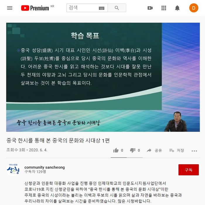 군은 매월 1회 인제대와 협력해 산청문화원 등에서 인문학 강좌를 개최해 왔다. 그러나 코로나19 여파로 각종 문화·강연 프로그램 중단이 장기화됨에 따라 비대면 유튜브 강연을 진행한다고 설명했다.