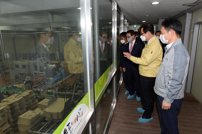 | ▲ 한정우 군수가 단감활용 가공품 공정 현장을 보고 있다. |