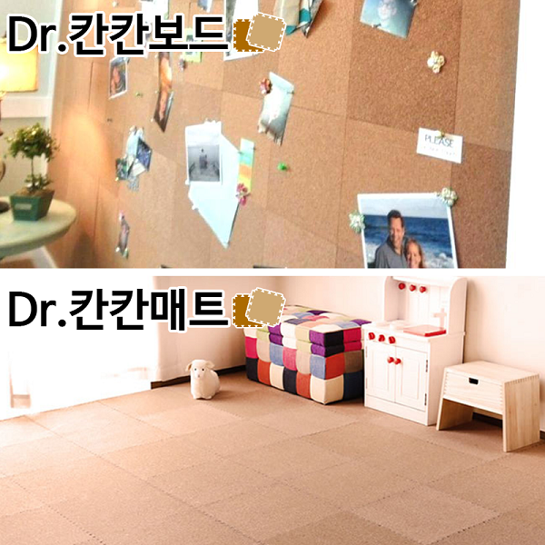 Dr.칸칸코르크보드는 대형메모보드게시판 폼보드 역할은 물론 폼블럭단열벽지로도 손색이 없어 방음벽으로 뛰어난 원목 인테리어 효과를 자랑한다. 또한 Dr.칸칸코르크매트는 거실매트는 물론이고 미럼방지매트, 주방매트 등 활용성이 뛰어나다.