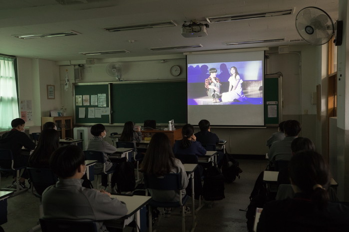 서울 양천구 주관으로 극단 앙상블이 최근 신남중학교 체육관에서 브로드웨이 수상작인 <유린타운>을 각색해 환경보호 필요성을 호소한 뮤지컬 ‘환경마을’을 공연하고 있다. 사진은 학생들이 뮤지컬을 교내방송으로 시청하고 있는 모습.(사진제공=양천구청)