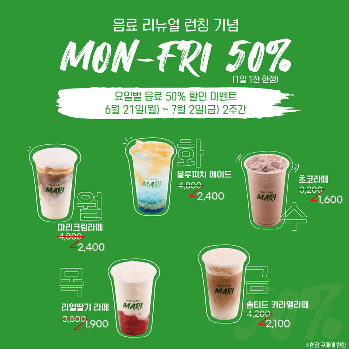 2주 동안 진행되는 이벤트 기간 동안 토스트카페마리 전 지점에 방문하는 고객에게는 월~금까지 요일별 음료를 50% 할인가에 제공한다.