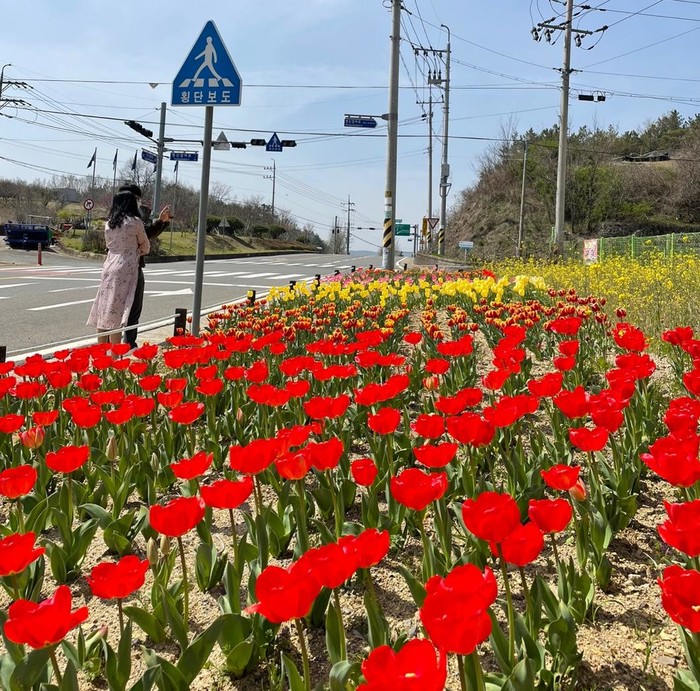 | ▲ 장마면 유리마을 도로변 튤립 꽃동산 모습이다. |