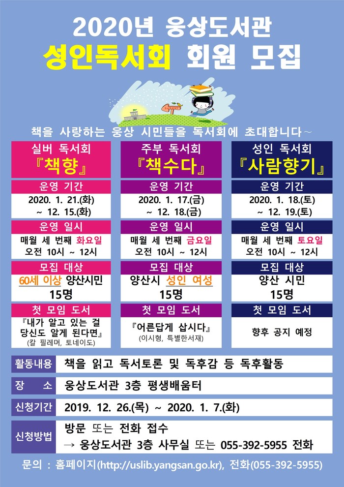 경남양산시 웅상 도서관은 책과 사람이 모이고 소통하는 장을 만들기 위해 2020년도 성인독서회 회원을 모집한다.
