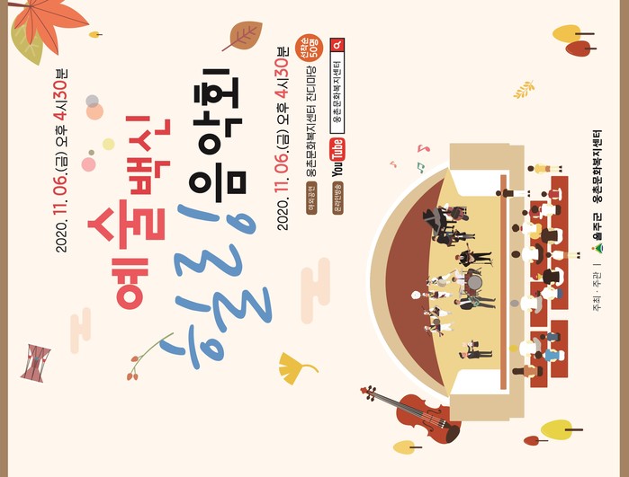 오는 11월 6일(금) 오후 4시 30분 웅촌문화복지센터 잔디마당에서 열리는 예술백신 힐링 음악회는 지역에서 활발하게 활동 중인 클래식 앙상블‘뻔뻔중창단’, 국악실내악단‘파래소’, 마술사‘신현재’, 인디밴드‘코맨스밴드’를 초청해 남녀노소 누구나 함께 듣고 즐길 수 있는 음악과 퍼포먼스로 준비했으며 행사에 맞춰 유튜브 라이브 시청도 가능하다.(유튜브‘웅촌문화복지센터’검색)