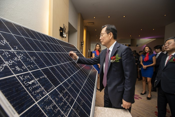 | ▲ 김종갑 사장이 태양광 패널에 기념 사인을 하고 있다.(사진제공=한전) |