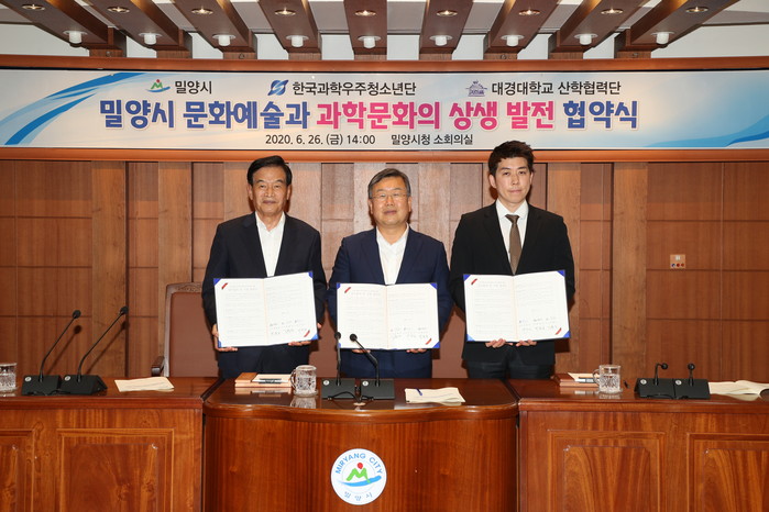 밀양시(시장 박일호)는 한국과학우주청소년단 및 대경대학교 산학협력단과 문화예술과 과학 문화 교류 활성화를 위한 3자간 업무 협약을 체결했다고 밝혔다.