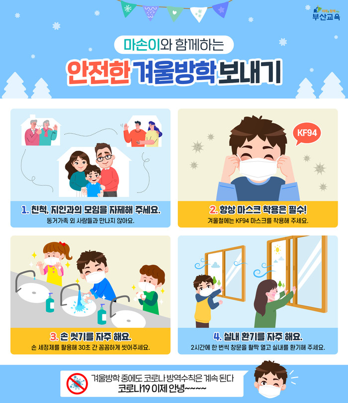 카드뉴스에는 ▲친척, 지인과의 모임 자제해요(동거가족 외 사람들과 만나지 않아요) ▲겨울에는 가능한 KF94 마스크 착용해요 ▲손 씻기를 자주 해요 ▲실내 환기를 자주 해요(2시간에 1번씩 창문 열고 실내환기) 등 겨울방학 기간 중 가정에서 꼭 지켜야 할 코로나19 방역수칙을 담았다.