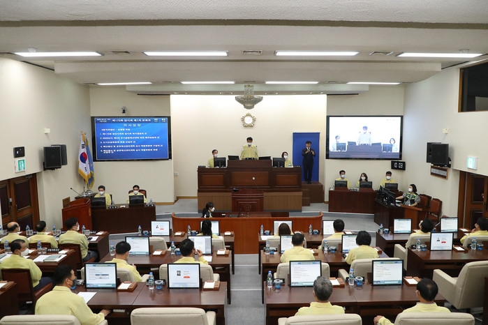 양산시의회는 코로나19 확산에 따른 사회적 거리두기 2단계 시행에 따라 이번 임시회 본회의에 집행부 국·소장만 참석하고, 시민들의 방청은 제한하였다.