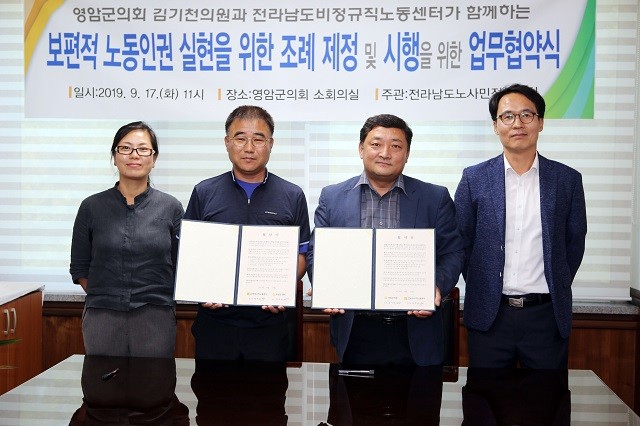 [영암=정찬남 기자] 김기천 영암군의회 의원과 전라남도비정규직노동센터가"보편적 노동인권 실현을 위한 조례의 제정 및 시행"에 관한 업무 협약을 체결했다.