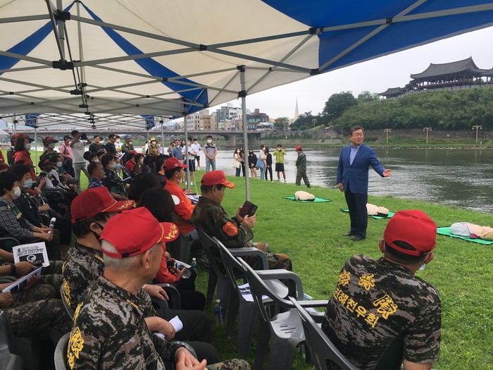 이번 시범 훈련은 물놀이 안전사고 예방을 위한 것으로, 해병대밀양시전우회의 구명환을 이용한 인명구조 시연을 시작으로, 구명환이 없을 경우 주변에서 흔히 볼 수 있는 페트병을 활용한 인명구조 시연, 심폐소생술 시연과 체험을 실시해 시민으로부터 큰 호응을 얻었다.