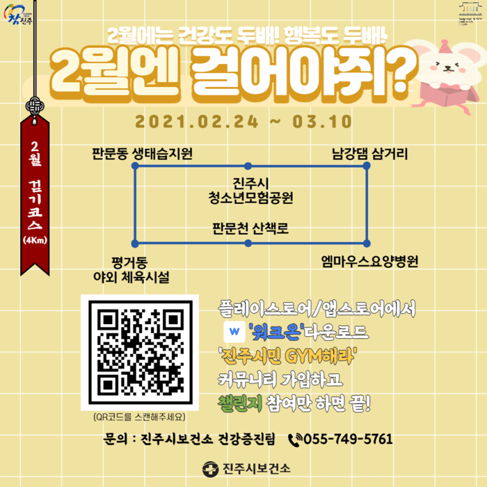 참여를 원하는 시민은 스마트폰 플레이스토어 또는 앱스토어에서 ‘워크 온(Walk On)’을 설치한 뒤, 진주시 보건소 공식 커뮤니티인 ‘진주시민 GYM 해라’에 가입해야 한다. 그 후 트로피 모양 챌린지 버튼을 눌러 ‘2월엔 걸어야쥐?’에 참여하여 지정된 걷기 코스를 걸으면 된다.