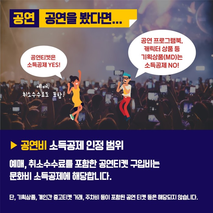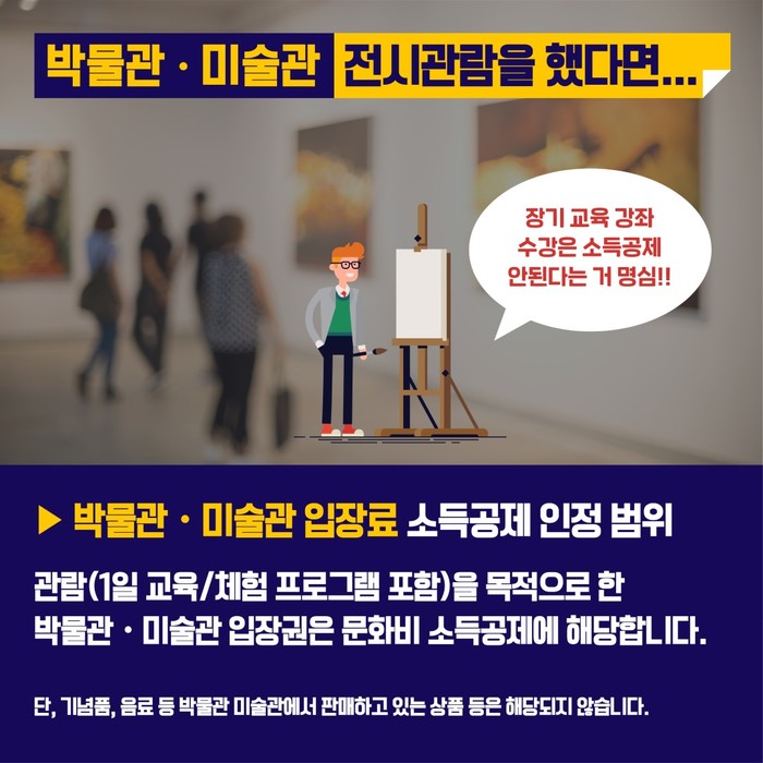 문화비 소득공제는 총 급여 7,000만 원 이하 근로소득자를 대상으로 도서구입비, 공연관람료 및 박물관·미술관 입장료에 대해 최대 100만원 이내에서 소득공제를 해주는 제도로, 문화비 소득공제 홈페이지에서 소득공제 제공 사업자를 확인할 수 있다.