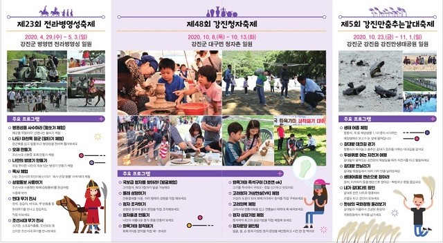 특히 전라병영성 축제에서는 활쏘기, 말 타기, 호패 만들기, 옥사 체험, 상평통보 사용하기를 청자축제에서는 청자 발굴, 물레 성형하기, 청자 조각, 고려청자 가상현실(VR) 체험을 갈대축제에서는 생태어종 맨손 잡기, 갈대밭 걷기 등 흥미롭고 이색적인 테마 체험을 운영한다.