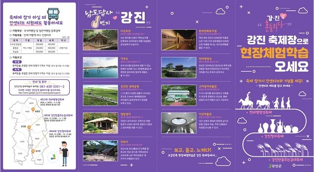 군은 지난 28일 학교 현장체험학습 유치를 위해“강진 축제장으로 현장체험학습 오세요”제목의 홍보 리플릿을 제작해, 협조 요청 공문과 함께 전국 초.중학교 9,301개소에 배부했다.