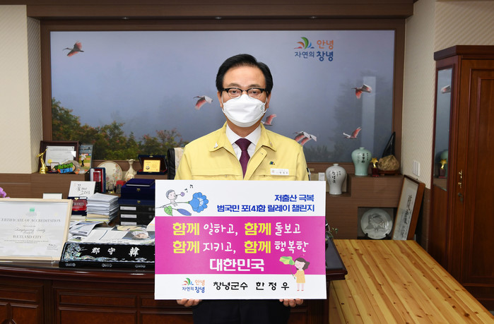 한정우 창녕군수는 9일 ‘저출산 극복 함께해요! 범국민 포(4)함 릴레이 챌린지’에 동참했다.