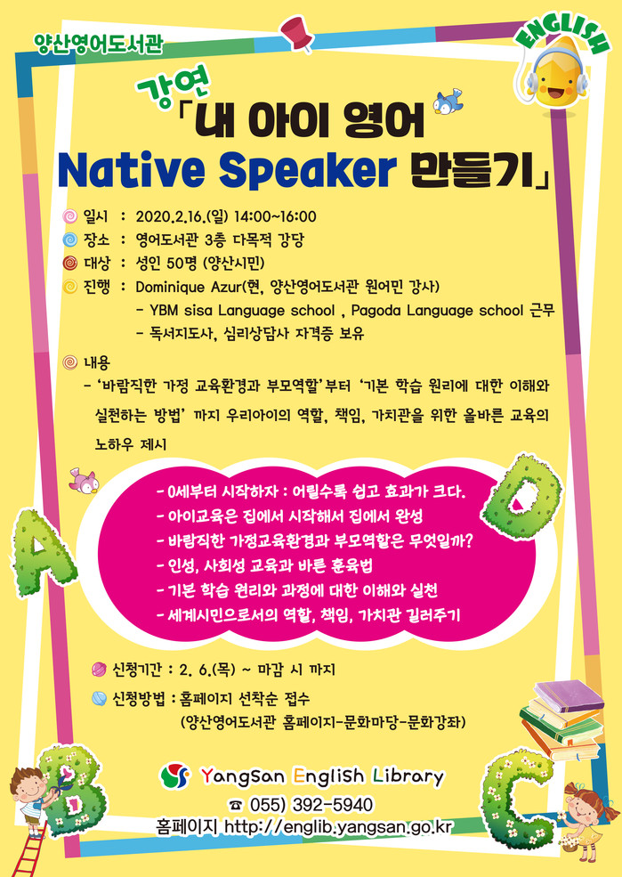 ‘내 아이 영어 Native Speaker 만들기’강연은 6일 오전 9시부터 선착순으로 접수할 수 있으며, 양산시민(학부모)이면 누구나 홈페이지를 통해 온라인 접수 가능하다.