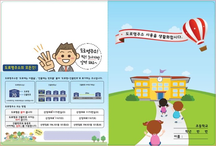 홍보물에는 도로명주소의 개념과 부여원리, 건물번호판을 보는 방법과 바른 표기법을 안내하고, 각 학교의 도로명주소를 직접 적어볼 수 있도록 했다.