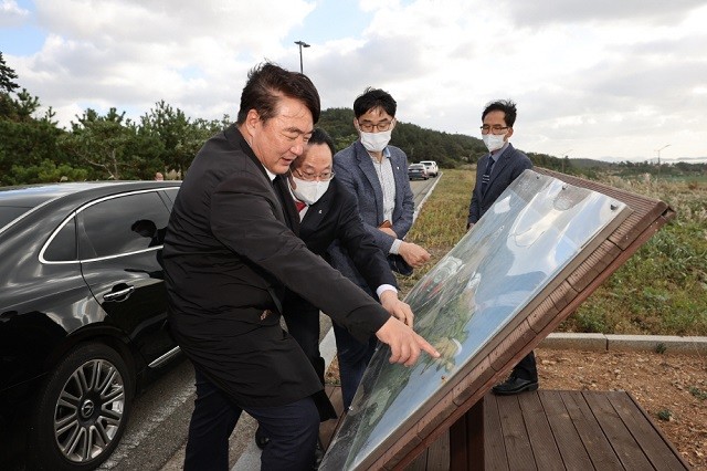 | ▲ 지난 23일 싱 하이밍 주한 중국대사가 해남군 화원면에 위치한 오시아노 관광단지를 방문해 명현관 해남군수가 가리키는 현장 위치도의 현재 위치를 확인하고 있다. / 해남군 제공 |